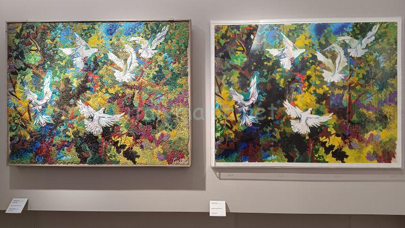 絵画と、その作品をモザイク画にした作品が並んで展示されています。