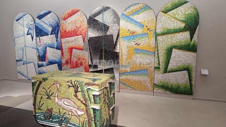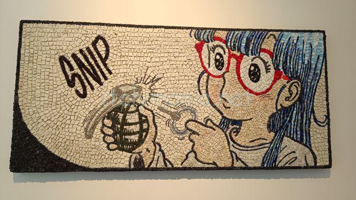 大聖堂や礼拝堂でみる宗教的なモザイク画とは違って、現代モザイクの作品をたくさん見ることができます。箱に施されたモザイク、モザイクのピアディーナと、アラレちゃんまでモザイク画になってました。